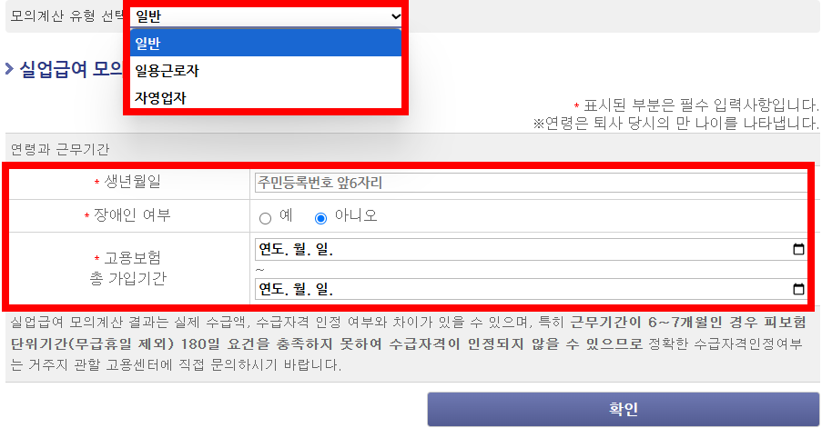 모의계산 유형 일반,일용근로자,자영업자중 선택하시고 연령과 근무기간 등을 입력해 주세요.