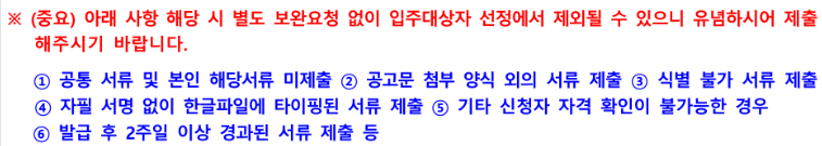 대상자 선정 및 소명대상 안내 등은 SMS 및 e-mail을 발송할 예정이오니, 입주 신청 시 본인의 연락처(핸드폰 번호)와 e-mail 주소를 정확히 기입해야 합니다 오기재로 인한 책임은 신청자 본인에게 있음을 참고 바랍니다.