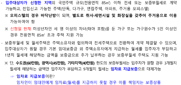 ※지역별 지원한도액을 초과하는 주택은 초과하는 전세금액을 입주대상자가 부담하고 임차권은 LH에 귀속되는 조건으로 지원 가능하며, 전세금 총액은 호당 지원한도액의 250% 이내로 제한합니다.(단, 가구원수가 5인 이상인 경우 호당 지원한도액 250% 초과가 가능합니다.)